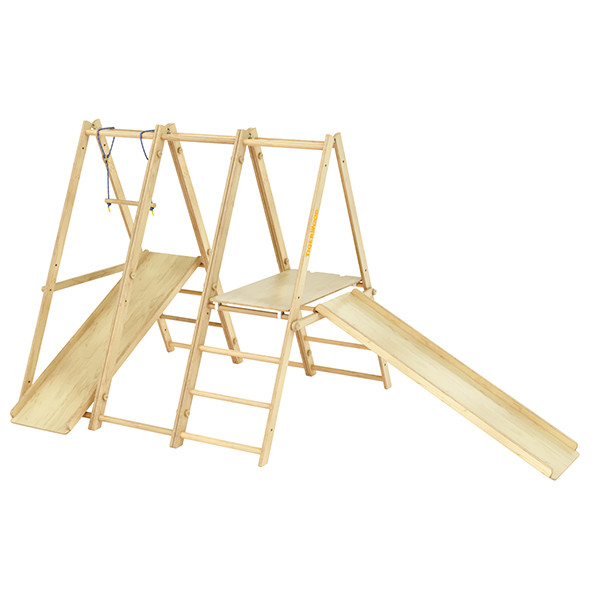Данный комплекс будет интересен для деток, которые умеют ходить, имеют много энергии, желания лазить и висеть. Можно выполнить подъемы корпуса, подтягивание на трапеции под углом, подъемы ног и другие упражнения для общего физического развития ребенка. К гимнастическому модулю возможно дополнительное оборудование: трапеция, качели, тарзанка, ортопедические кольца, круглые кольца, веревочная лестница, диск и т.д. Помогает в укреплении мышечного каркаса и формировании правильной осанки ребенка. На модуле площадка ребенок может стоять и сидеть, при этом хватает места для игр. Площадка прочно крепится, при этом просто снимается и ставится обратно, а если снять горку и поставить стульчик, то площадка может превратиться в стол.